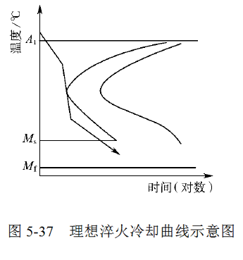 理想淬火介质的冷却曲线(见图5-37)应只在C曲线“鼻尖”处快冷,而在Ms附近尽量缓冷,以达到既获得马氏体组织,又减小内应力的目的。但目前还没有找到这种理想的淬火介质。