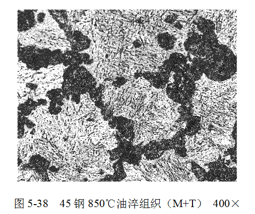 碳量£0.5%时,淬火后组织为马氏体,如图5-34所示;当含碳量>0.5%时,淬火后组织为马氏体与少量残余奥氏体。亚共析钢在Ac1 ~Ac3之间加热淬火后的组织为马氏体加铁素体,如图5-35所示,由于组织中有自由铁素体存在,使钢的强度和硬度降低,但可改善韧性,这种淬火称为亚温淬火,如处理得当,亚温淬火也可作为一种强韧化处理方法。
