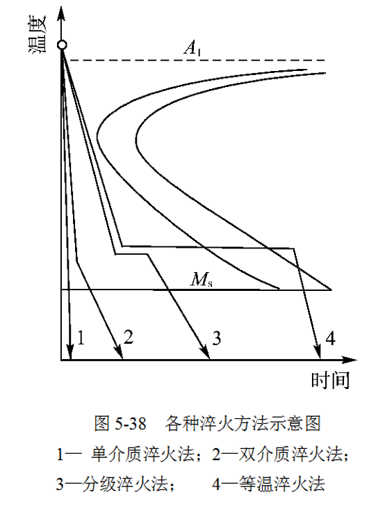 采用适当的淬火方法可以弥补冷却介质的不足。常用的淬火方法如图5-38所示。