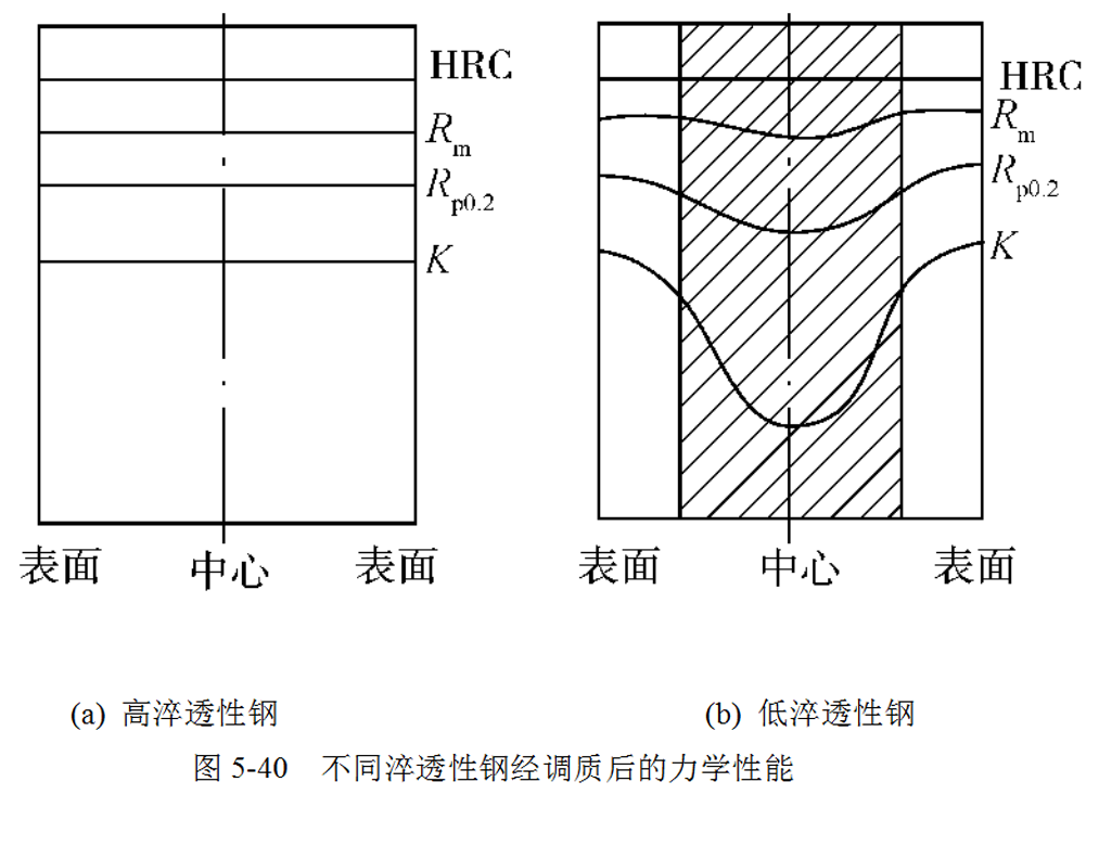 图5-40为两种淬透性不同的钢制成相同的轴经调质处理(淬火加高温回火)后其力学性能的比较。高淬透性钢的整个截面都是回火索氏体(渗碳体为颗粒状)组织,力学性能均匀,强度高,韧性好。而低淬透性钢的心部组织为片状索氏体加铁素体,韧性差。此外,淬火组织中马氏体量增加还会提高钢的屈强比ss/sb和疲劳极限s-1。