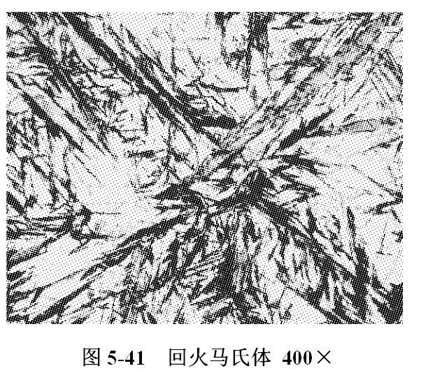 回火温度为150-250℃。低温回火时,马氏体将发生分解,从马氏体中析出e-碳化物(FeXC),使马氏体过饱和度降低。析出的碳化物以细片状分布在马氏体基体上,这种组织称为回火马氏体,用M回表示。在光学显微镜下M回为黑色,A’为白色,如图5-41所示。由于马氏体分解,其正方度下降,减轻了对残余奥氏体的压力,马氏体点上升,因而残余奥氏体分解为e-碳化物和过饱和铁素体,即转变为M回。