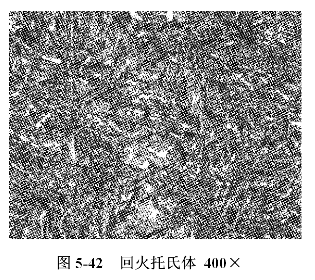 回火温度为350-500℃。中温回火时,e-碳化物溶解于铁素体中,同时从铁素体中析出Fe3C。到350℃,马氏体中的含碳量已降到铁素体的平衡成分,内应力大量消除,M回转变为在保持马氏体形态的铁素体基体上分布着细粒状组织,称为回火托氏体,用T回表示,如图5-42所示。