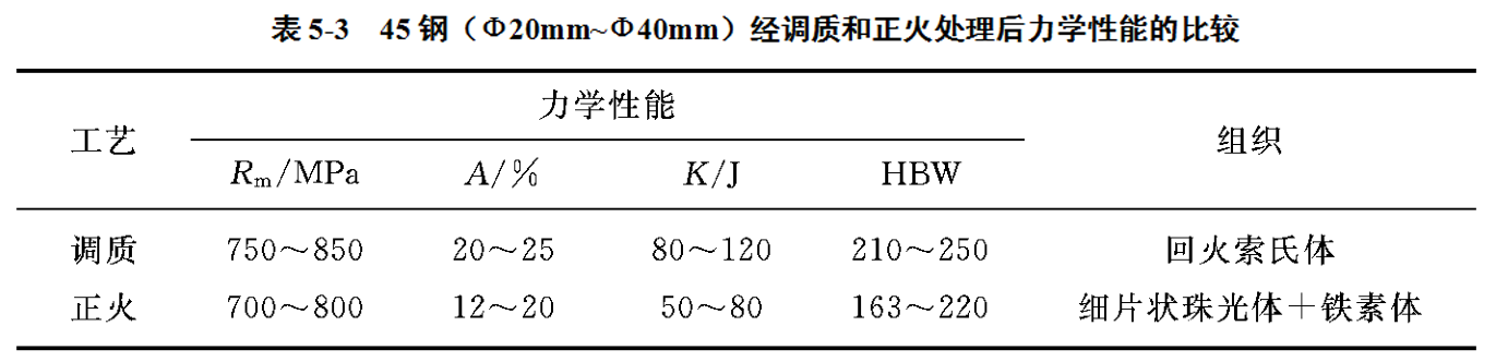 回火索氏体组织具有良好的综合力学性能,即在保持较高的强度同时,具有良好的塑性和韧性,硬度一般为25~35HRC。通常把淬火加高温回火的热处理工艺称作“调质处理”,简称“调质”。表5-3为45钢经调质和正火处理后力学性能的比较,由于调质组织中的渗碳体是颗粒状的,正火组织中的渗碳体是片状的,而粒状渗碳体对阻碍裂纹扩展比片状渗碳体更有利,因而调质组织的强度、硬度、塑性及韧性均高于正火组织。调质广泛用于各种重要结构件如连杆、轴、齿轮等的处理。也可作为某些要求较高的精密零件、量具等的预备热处理。