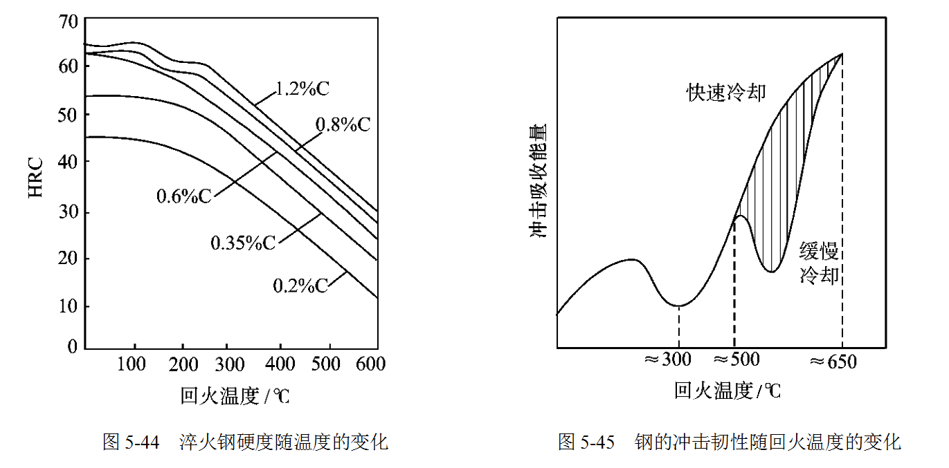 回火时的组织变化必然引起力学性能的变化。总的趋势是随回火温度提高,钢的强度、硬度下降,塑性、韧性提高。图5-44为淬火钢硬度随回火温度的变化。可以看出,在200℃以下回火时,由于马氏体中碳化物的弥散析出,钢的硬度并不下降,高碳钢硬度甚至略有提高。在200-300℃回火时,由于高碳钢中的残余奥氏体转变为回火马氏体,硬度再次升高。300℃以上回火时,由于渗碳体粗化,马氏体转变为铁素体,硬度直线下降。