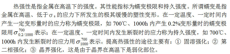 2、提高热强性 ①加入Cr、Ni、W、Mo等元素的作用是产生固溶强化、形成单相组织并提高再结晶温度,从而提高高温强度;②加入V、Ti、Nb、Al等元素的作用是形成弥散分布且稳定的VC、TiC、NbC等碳化物和稳定性更高的Ni3Ti、Ni3Al(g’)、Ni3Nb(g’’)等金属间化合物,它们在高温下不易聚集长大,有效地提高高温强度;③加入B、Zr、Hf、RE等元素的作用是净化晶界或填充晶界空位,从而强化晶界,提高高温断裂抗力。