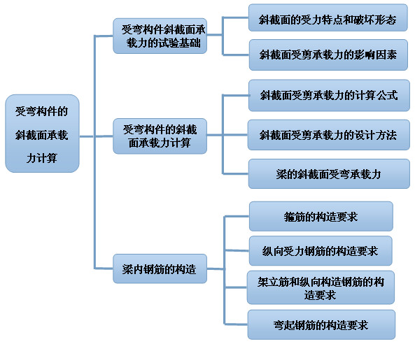 4.受弯构件斜截面承载力计算公式: ①建立计算公式的原则;②斜截面受剪模型;③梁受剪承载力计算公式;④截面限制条件及最小配箍率。