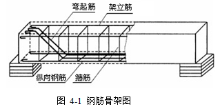 为了防止梁沿斜截面破坏,就需要在梁内设置足够的抗剪钢筋,通常由与梁轴线垂直的箍筋和与主拉应力方向平行的斜筋共同组成,如图4-1所示。斜筋常利用正截面承载力多余的纵向钢筋弯起而成,所以又称弯起钢筋。箍筋与弯起钢筋通称腹筋。配置箍筋与弯起钢筋的梁,称为有腹筋梁。不配置箍筋与弯起钢筋的梁,称为无腹筋梁。