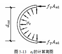 当间接钢筋达到屈服时,计算简图如图5-13所示,根据力的平衡条件,得间接钢筋所约束的核心截面面积内的混凝土强度为