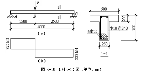 【例4-2】已知某工作桥纵梁,梁截面尺寸b×h=250×600mm及计算简图如图4-16(a)所示。处于一类环境,安全等级为二级,γ0=1.0。梁上受均布荷载设计值q=20.0kN/m(包括自重)及集中力设计值Qk=110kN;梁中已配有纵向HRB335级钢筋4B22(As=1520mm2);混凝土强度等级为C25,箍筋为HPB300级钢筋。试配抗剪腹筋。