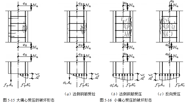 大偏心受压构件破坏时的截面应力分布与构件上的裂缝分布情况如图5-15所示。