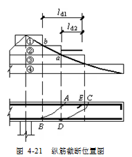 受弯构件的支座截面纵向受拉钢筋可以在保证斜截面受弯承载力的前提下截断。图4-18中,近似地按钢筋截面面积的比例划分出每根钢筋所承担的抵抗弯矩,即Mui=MuAsi/As。假定①号纵筋抵抗控制截面A-A的弯矩为图中纵坐标34部分,A-A为①号纵筋强度充分利用截面(4点称为其“充分利用点”);沿3点作水平线交M 图于b、c点, 这说明在截面B-B、C-C处按正截面受弯承载力已不再需要①号钢筋了,B-B和C-C截面为按计算不需要该钢筋截面,可以把①号钢筋在b、c点截断,b、c点称为该钢筋的“理论截断点”。当在b、c点把①号钢筋截断时,则在Mu图上就产生抵抗矩的突然减小,形成矩形台阶ab和cd。
