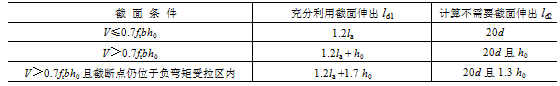 结构设计中,应从上述两个条件中选用较长的外伸长度作为纵向受力钢筋的实际延伸长度ld,以确定其真正的切断点。《结构规范》规定:钢筋混凝土连续梁、框架梁支座截面的负弯矩钢筋不宜在受拉区截断。当必须截断时,其延伸长度可按表4-2中ld1和ld2中取外伸长度较大者确定。其中,ld1是从“充分利用该钢筋强度的截面”延伸出的长度;ld2是从“按正截面承载力计算不需要该钢筋的截面”延伸出的长度。la为受拉钢筋的锚固长度,d为钢筋的公称直径,h0为截面的有效高度。