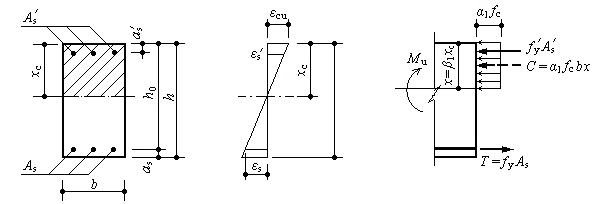 已知截面弯矩设计值M,截面尺寸b×h、混凝土强度等级和钢筋级别,受拉钢筋As和受压钢筋A¢s,复核正截面受弯承载力Mu是否足够。