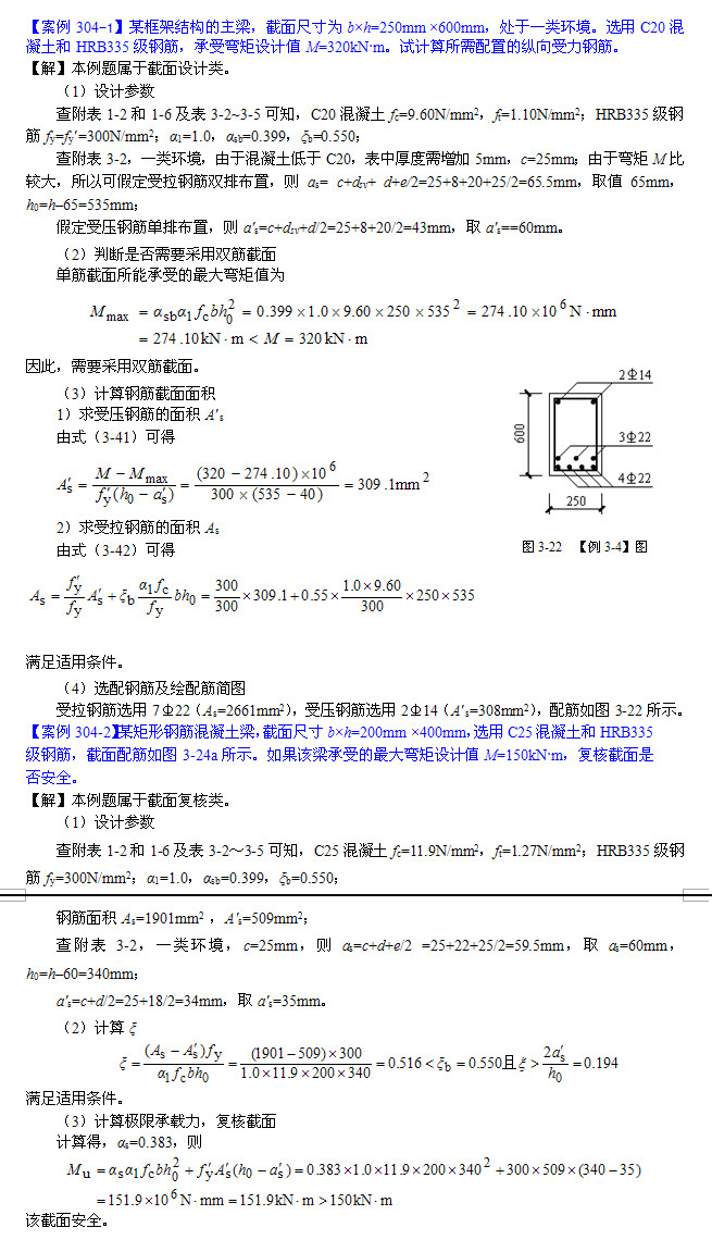 对于HRB335、HRB400级钢筋以及常用的as¢/h0值的情况下,由式(3-40)得x≥xb,根据适筋公式适用条件,取x=xb。对于HPB300级钢筋,在混凝土强度等级小于C50时,若仍取x=xb,则钢筋用量会略有增加,此时可取x=0.55。