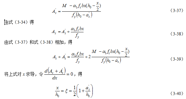 求解As、A¢s和x三个未知量,只有式(3-34)和(3-35)两个基本计算公式,需补充一个条件才能求解。在截面尺寸和材料强度确定的情况下,当(As+A¢s)最小时最节约钢材。一般情况下,取fy=fy¢。