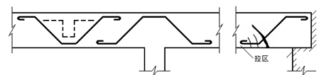 当为了满足材料抵抗弯矩图的需要,不能弯起纵向受拉钢筋时,可设置单独的受剪弯起钢筋。单独的受剪弯起钢筋应采用“鸭筋”,而不应采用“浮筋”,否则一旦弯起钢筋滑动将使斜裂缝开展过大(图3-65)。
