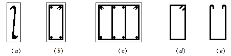 箍筋的肢数分单肢、双肢及复合箍(多肢箍),箍筋一般采用双肢箍,当梁宽b>400mm且一层内的纵向受压钢筋多于3根时,或当梁宽b<400mm但一层内的纵向受压钢筋多于4根时,应设置复合箍筋(图3-55c);梁截面高度减小时,也可采用单肢箍(图3-55a)。