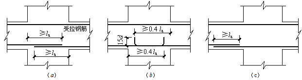 连续梁在中间交座处,一般上部纵向钢筋受拉,应贯穿中间支座节点或中问支座范围。下部钢筋受压,其伸入支座的锚固长度分三种情况考虑: