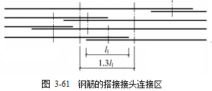 钢筋绑扎搭接接头连接区段的长度为1.3倍搭接长度。凡搭接接头中点位于该连接区段长度内的搭接接头均属于同一连接区段(如图3-61)。同一连接区段内纵向钢筋搭接接头面积百分率为该区段内搭接接头的纵向受力钢筋截面面积与全部纵向受力钢筋截面面积的比值。