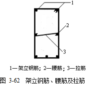 ①当梁的截面较高时,常可能在梁侧面产生垂直梁轴线的收缩裂缝。因此,当梁的腹板高hw≥450mm,在梁的两个侧面应沿高度配置纵向构造钢筋(如图3-62),每侧纵向构造钢筋(不包括梁上、下部受力钢筋及架立钢筋)的截面面积不应小于腹板截面积bhw的0.1%,且其间距不大于200mm。