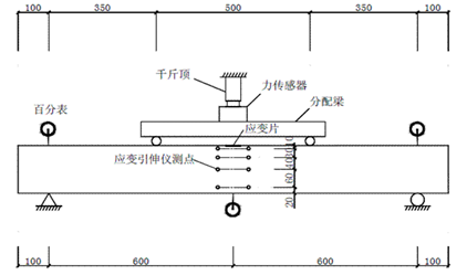 1. 试验梁支承于台座上,通过千斤顶和分配梁施加两点荷载,由力传感器读取荷载读数。