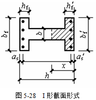 I形截面的一般截面形式如图5-28所示,其两侧翼缘的宽度及厚度通常是对应相同的,即bf'= bf 、hf'= hf ,翼缘厚度不宜小于120mm,腹板厚度b不宜小于100mm。