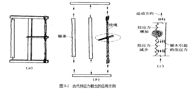 我国古代已经自觉不自觉的运用了预应力的概念。实例如:①木制浴桶的铁制桶箍;②用手搬一摞书时,要用双手对书施加一个预压力以确保书不会掉落;③鲁班锯的锯条;④自行车车圈与辐条。