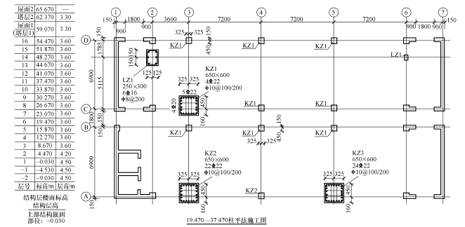 从图中可以看出,在同一编号的框架柱KZl中选择1个截面放大,直接注写截面尺寸和配筋数值。该图表示的是从-0.030~37.470 m的标高段,柱的断面尺寸及配筋情况。其他均与列表注写方式和常规的表示方法相同,不再赘述。