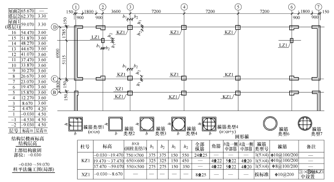 其次结合图、表阅读,可以看出该柱分3个标高段,①从-0.030~19.470 m为第1个标高段,柱的断面为750mm×700 mm。b方向中心线与轴线重合,左右都为375 mm。h方向有偏心,hl为150 mm , h2为550 mm。全部纵筋为24根C25的钢筋。箍筋选用类型号1(5×4),意思是箍筋类型编号为1,箍筋肢数b方向为5肢,h方向为4肢。加密区的箍筋为A10@ 100,即直径为10 mm的HPB300钢筋,间隔100 mm。非加密区为Al0@ 200,即直径为10 mm的HPB300钢筋,间隔200mm。②从19.470~37. 470 m为第2个标高段,柱的截面为650 mm ×600 mm。b方向中心线与轴线重合,左右都为325 mm。h方向有偏心, h1为150 mm,h2为450 mm。四个大角钢筋为4C22的钢筋。b边一侧中部钢筋为5C22,即b边两侧中部钢筋共配10根直径为22mm的HRB400钢筋。h边一侧中部钢筋为4C20的钢筋,即h边两侧中部钢筋共配8根直径为20mm的HRB400钢筋。故在19.470~37.470 m范围内一共配有C22的HRB400钢筋14根和C20的HRB400钢筋8根。箍筋选用类型号1(5×4),意思是箍筋类型编号为1,b方向为5肢,h方向为4肢。箍筋的配置同第一个标高段。