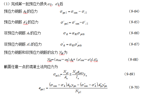 预应力混凝土受弯构件在预应力张拉施工阶段的受力过程同前述预应力混凝土轴心受拉构件,计算预应力混凝土轴心受拉构件截面混凝土的有效预压应力spcI、spcII时,可分别将一个偏心压力NpI、NpII作用于构件截面上,然后按材料力学公式计算。压力NpI、NpII由预应力钢筋和非预应力钢筋仅扣除相应阶段预应力损失后的应力乘以各自的截面面积并反向,然后再叠加而得(图9-26)。计算时所用构件截面面积为:先张法用换算截面面积A0,后张法用构件的净截面面积An。公式表达时应力的正负号规定为:预应力筋以受拉为正,非预应力钢筋及混凝土以受压为正。