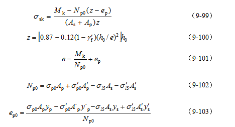 纵向钢筋等效应力σsk可由图9-29对受压区合力点取矩求得,即