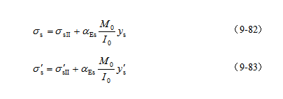 spcIs(spcIIs)、s'pcIs(s'pcIIs)——荷载作用的受拉区、受压区非预应力钢筋各自合力点处混凝土的应力。