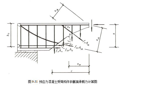 预应力混凝土受弯构件的斜截面受弯承载力计算如图9-31所示,计算公式为
