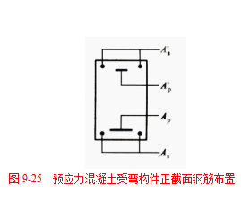 如图9-25所示的预应力混凝土受弯构件的正截面,在荷载作用下的受拉区(施工阶段的预压区)配置预应力钢筋Ap和非预应力钢筋As;同时为了防止在制作、运输和吊装等施工阶段,在荷载作用下的受压区(施工阶段的预拉区)出现裂缝,相应地配置预应力钢筋A'p和非预应力钢筋A's。