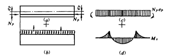 预应力混凝土受弯构件的受力特点在制作、运输和安装等施工阶段与使用阶段是不同的。在制作时,构件受到预压力及自重的作用,使构件处于偏心受压状态,构件的全截面受压或下边缘受压、上边缘受拉,如图9-27(a)。在运输、吊装时如图9-27(b),自重及施工荷载在吊点截面产生负弯矩如图9-27(c),与预压力产生的负弯矩方向相同如图9-27(d),使吊点截面成为最不利的受力截面。因此,预应力混凝土构件必须进行施工阶段的混凝土应力控制验算。