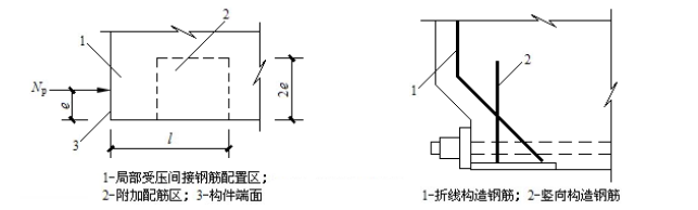 (2)当构件在端部有局部凹进时,为防止在预加应力过程中,端部转折处产生裂缝,应增设折线构造钢筋(如图9-36)。