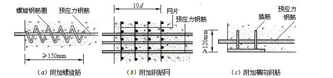 (2)对分散布置的多根预应力钢筋,在构件端部10d(d为预应力钢筋的公称直径)范围内应设置3~5片与预应力钢筋垂直的钢筋网(图9-34b);