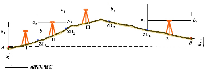 当欲测的高程点距水准点较远或高差很大时,就需要连续多次安置仪器以测出两点的高差。
