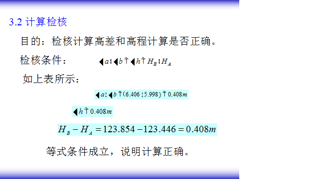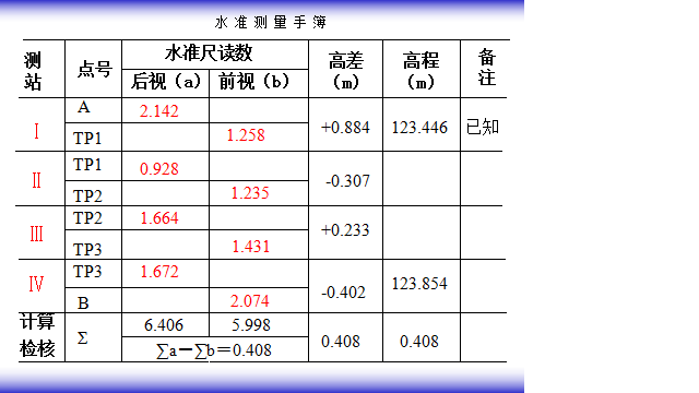 即:B点对A点的高差等于各转点之间高差的代数和,也等于后视读数之和减去前视读数之和,说明高差和各转点高程的计算是正确的。