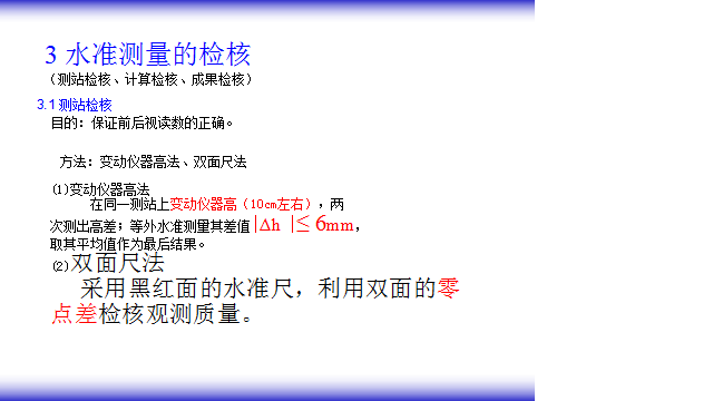 双面尺法:仪器高度不变,立在前视点和后视点上的水准尺分别用黑面和红面各进行一次读数,测得两次高差,相互进行检核。