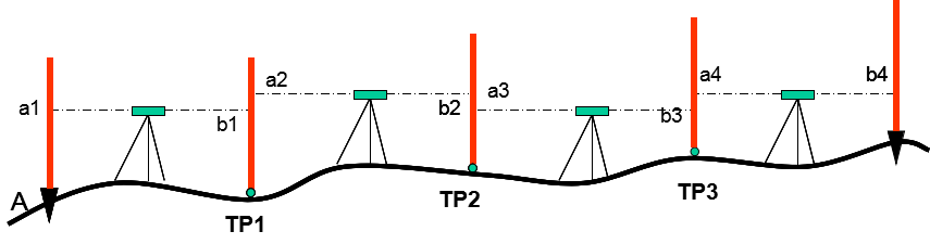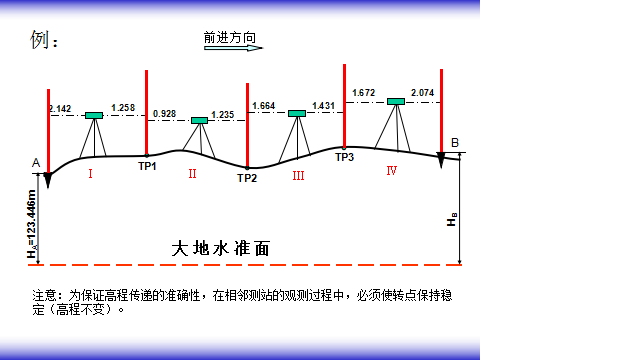 B点的高程是根据A点的已知高程和转点之间的高差计算出来。若其中测错任何一个高差,B点高程就不会正确。因此,对每一站的高差,都必须采取措施进行检核测量。