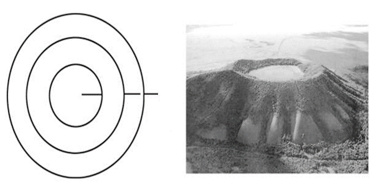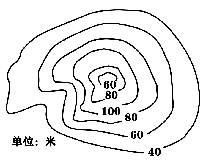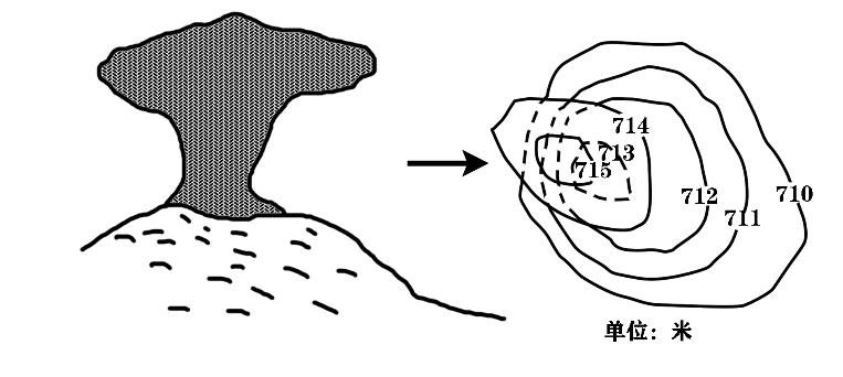 (1)火山口等高线地形图:火山口它通常位于火山的顶端,是一个圆形洼地。