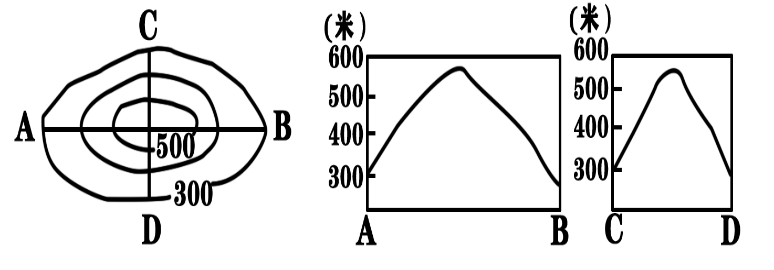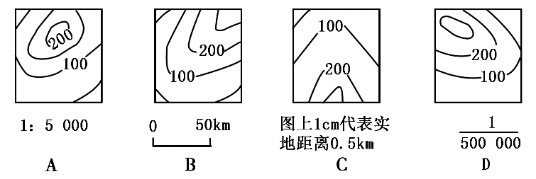 ③比例尺不同,等高距相同,则比例尺越大,坡度越大;比例尺越小,坡度越小。例如,下 图中的坡度由大到小的顺序为:A>C>D>B。