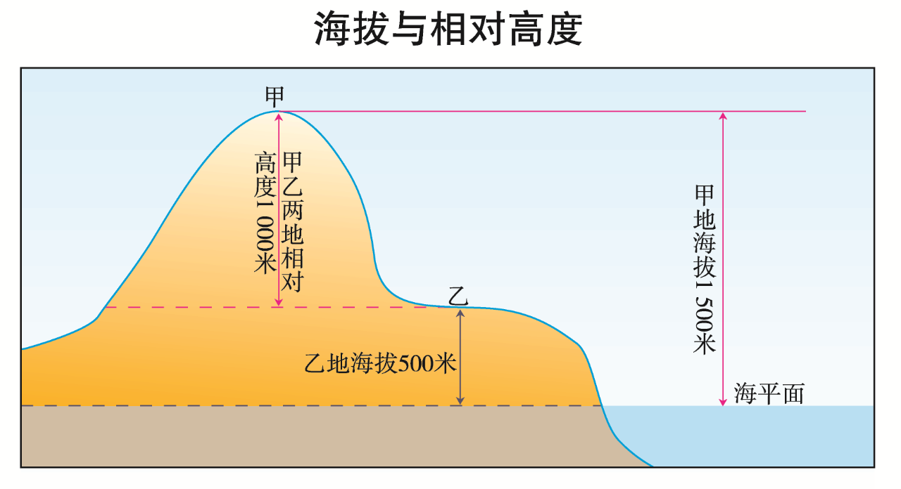 图中甲点的绝对高度为 2500米,乙点的绝对高度为 1000米,丙点的绝对高度为 1800米,丁点的绝对高度为 -500米。2.相对高度:指地面某个地点高出另一个地点的垂直距离。图中甲乙的相对高度为 1500米,乙丙的相对高度为 800米,丙丁的相对高度为 2300米。1.定义:地图上高程相等的各相邻点所连成的闭合曲线。
