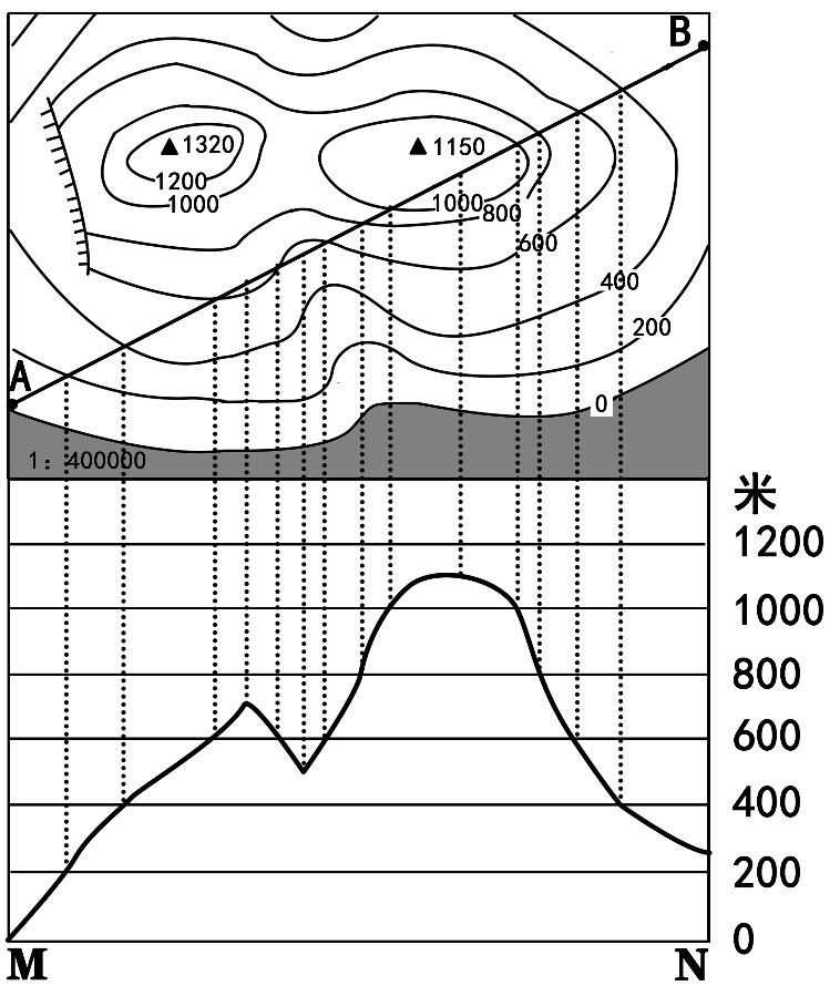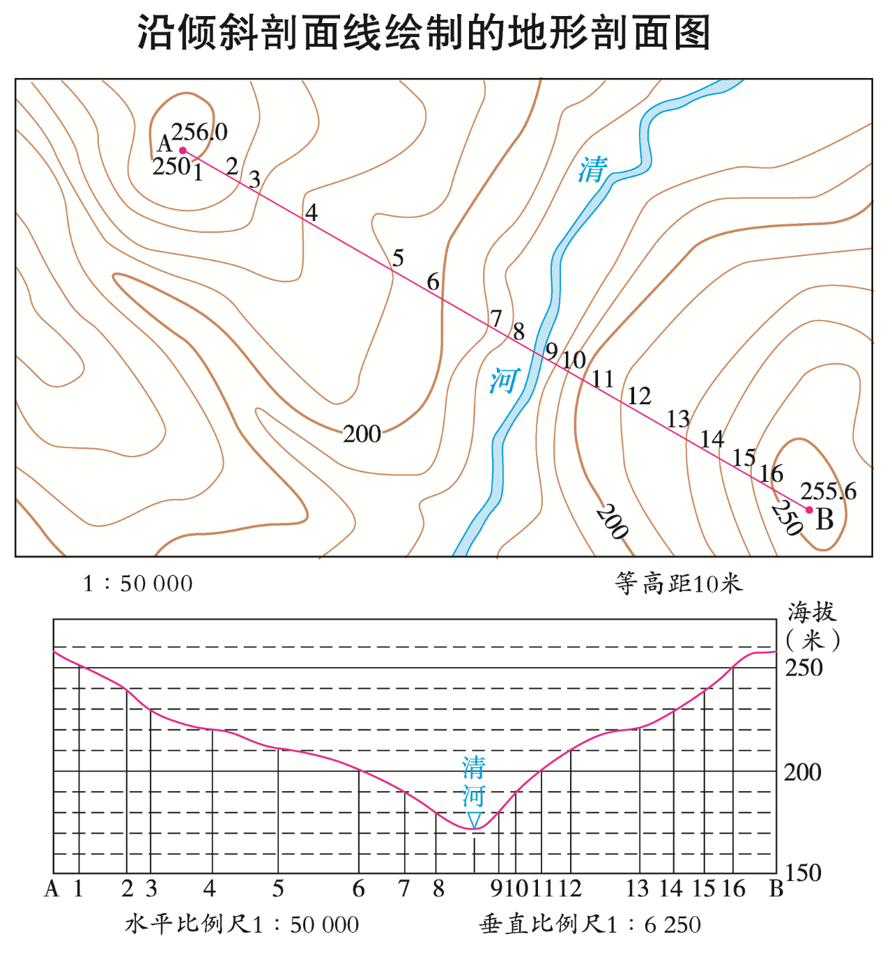 ②有时仅看两地的“凹凸坡”不能确定视野情况。因为两地之间可能有山脊存在,这种情况下,“凹形坡”也不能通视,如下图中A地不能看到B地。(2)判定河流流向:受河流侵蚀作用影响,上游横剖面图上河谷呈“V”形;下游堆积作用明显,横剖面图上河谷呈“U”形。由此可判定河流上下游关系及河流流向。