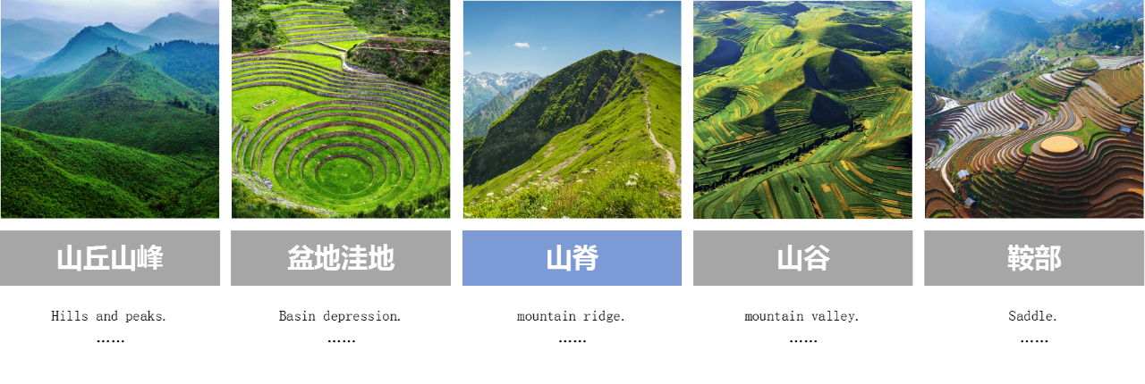 | 等高线弯曲程度不同,弯曲程度较大的地方(山脊或谷地)地势起伏较大;弯曲程度较小的地方地势比较平缓 |