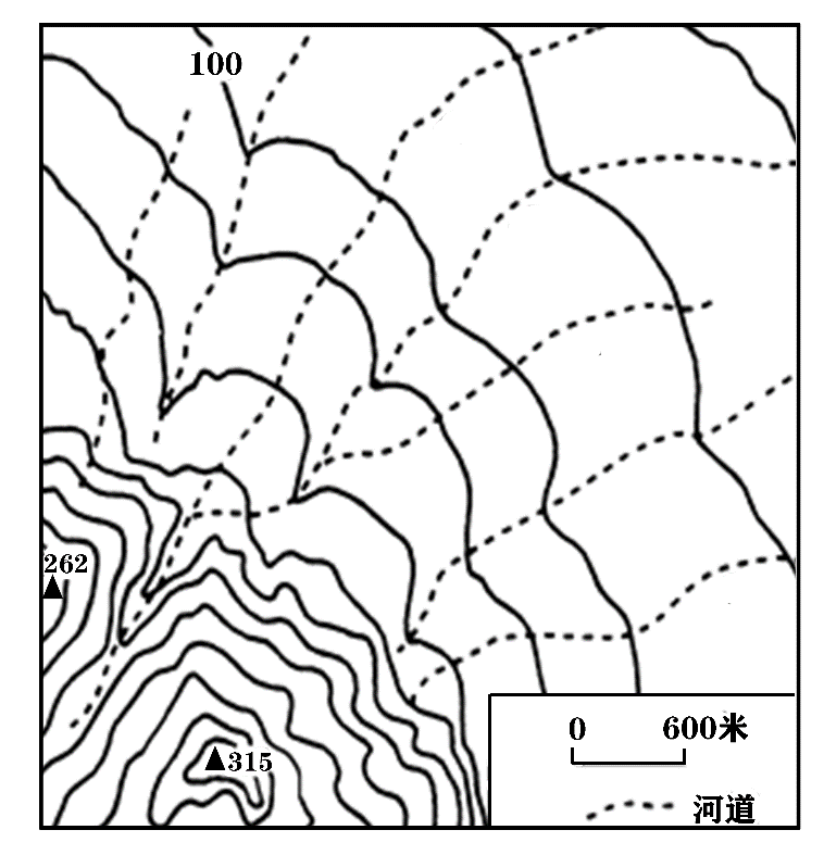 (2)冲积扇地形图:冲积扇像个大的山脊,但在河流经过的地方,又可以看到小的山谷。