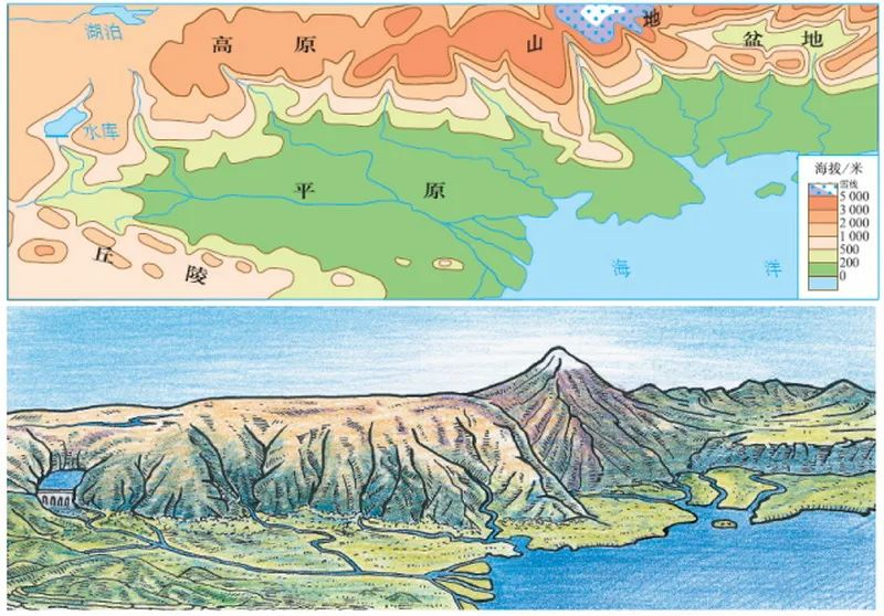 1.颜色:海洋用蓝色,平原用绿色,低山丘陵用黄色,山地和高原用棕褐色浅紫色表示积雪、冰川。在不同的等深线之间,用分层设色法着上深浅不同的蓝色,可以用来表示海底的深度。在不同的等高线之间,绿色越浓,表示地势越低;棕褐色越深,表示地势越高;雪线以上的地区通常用白色表示。2.间距:分层设色地形图不用遵守“等距”原理,两条线之间的间隔可以是不同的,而黑白的等高线图、等温线图等都需要是“等距”的,相邻的两条线之间的间隔都是一样的。3.意义:分层设色地形图的立体感强,它既能表示海拔,又能表示相对高度,所以它既能表示地势,又能在一定程度上表示各种地形类型。分层设色地形图上各种颜色表示的高度范围,可以查看图上所附的等高线分层设色表。