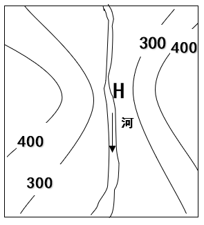 (8)地上河等高线地形图:在地上河等高线图中表现为河道整体部分等高线向低海拔处凸出,而河床处等高线则向高海拔处凸出。