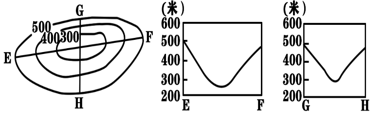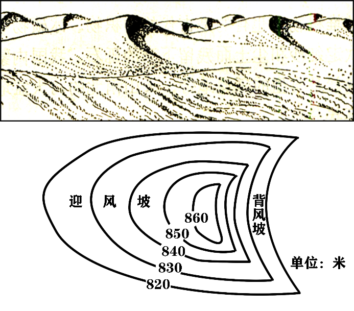 (3)沙丘等高线地形图:沙丘是在风力作用下由沙粒聚成的沙堆。迎风坡凸而平缓 ,背风坡凹而较陡